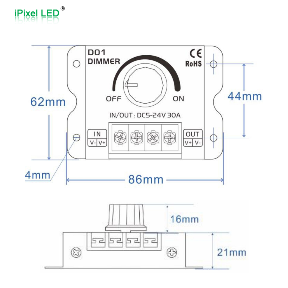 30A knob Dimmer is a dedicated intelligent LED lighting dimmer controller which is adopt the most advanced PWM (Pulse Width Modulation) digital dimming technology, It has the advantages of high power load, soft dimming, noiseless, no flicker and stable performance etc. Users not only can through the knob of dimmer achieve step-less dimming but also can use RF14 keys remote to turn on/turn off light, choose 10%-20%-40%-60%-80%-100% different brightness directly, set different lighting modes, 60s delay off turn off light etc. Is used to control a variety of led lamps as the light source, for instance, point source of light, flexible light strip and so on