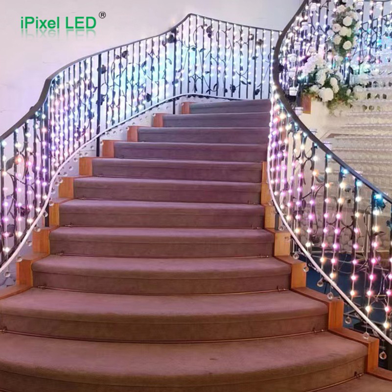 Ø23mm transparent PVC crystal ball with 360° viewing; DC12V SPI/UCS1903 addressable control, IP65 waterproof. Standard 26pcs/string with 100mm pitch, designed to be installed via T-type connectors for fast multi-string connection.
