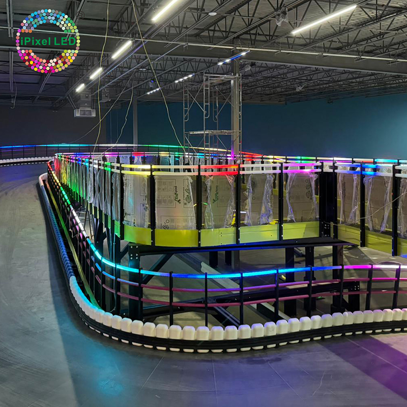 Addressable strip for kart track decoration: 30pcs 5050 RGB/m, 10 pixels/m, cuttable every 100mm/section. Multiple waterproof processes (IP20/IP64/IP65/IP67). For projects, DC24V and long-roll supply can be customized to support long runs and faster insta